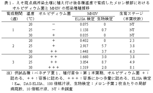 表1 えそ斑点病汚染土壌に植え付け後各種温度で育成したメロン根部におけるオルピディウム菌とMNSVの感染増殖推移