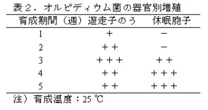 オルピディウム菌の器官別では、摂氏25度で管理すると1週間後には遊走子のうが認められて次第に増加し、3週間後には休眠胞子も検出され始める(表2)。