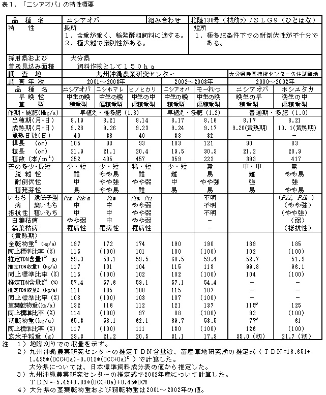 - 水稲「ニシアオバ」は、地上部全重が重く、難脱粒性で、ホールクロップサイレージとしての発酵品質や嗜好性も良好である。玄米は極大粒で、主食用水稲品種との識別が容易である。