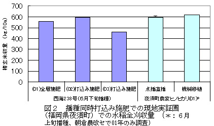 図2 播種同時打込み施肥での現地実証圃(福岡県夜須町)での水稲全刈収量