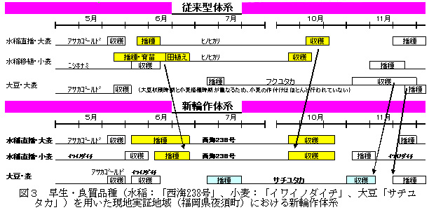 図3 早生・良質品種(水稲:「西海238号」、小麦:「イワイノダイチ」、大豆「サチユタカ」)を用いた現地実証地域(福岡県夜須町)における新輪作体系