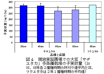 図4 現地実証圃場での大豆「サチユタカ」多条播栽培の子実収量(2002,03年各2播種時期の坪刈り値平均とSE、フクユタカは2年1播種時期の平均値)
