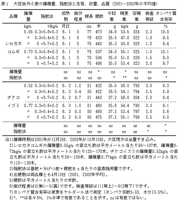 表1 大豆後作小麦の播種量、施肥法と生育、収量、品質(2001〜2002年の平均値)