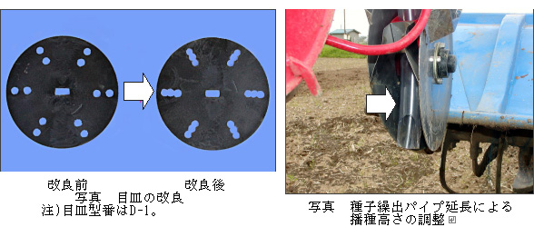 播種機の改良は慣行の目皿式播種機の目皿にドリル等で穴を開け、1か所にまとまって3粒落ちるように種子繰出パイプを地際近くまで延長する。