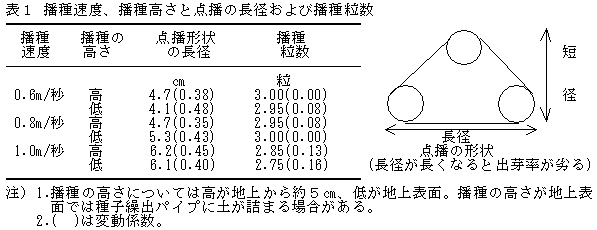 播種速度0.6〜0.8m/秒では点播の長径、播種粒数に差はみられなかったが、1.0m/秒になると、長径が6cm程度と広く、播種粒数が少なくなる傾向が認められる。播種の高さは5cm程度までならば点播の形状への影響はほとんどみられない(表1)。