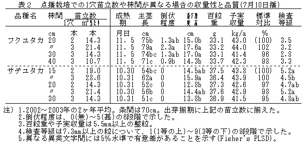 条間70cmの場合、3粒点播における最適栽植密度はフクユタカでは倒伏程度や最下着莢高からみて株間30cm、サチユタカでは収量性や最下着莢高からみて株間15cmである(表2)。