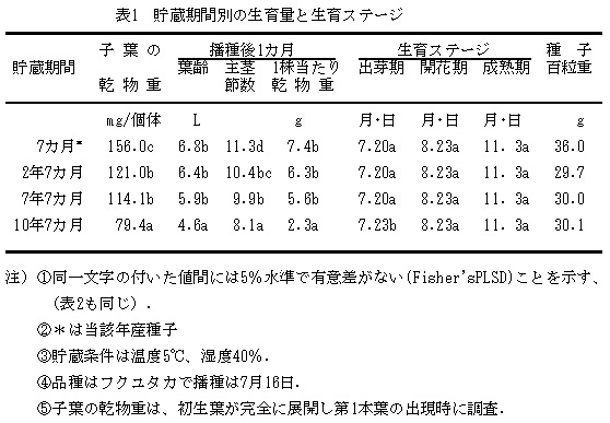 温度摂氏5度、湿度40%で貯蔵した場合、7年7カ月までは播種後1カ月の主茎節数を除いて葉齢、1株当たり乾物重に対する貯蔵の影響はない。10年7カ月貯蔵では生育に影響を及ぼす子葉の乾物重は軽く、播種後1カ月の生育量は劣る(表1)。