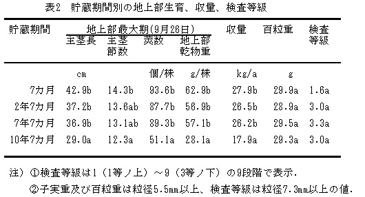 収量、百粒重および検査等級において、貯蔵期間が2年7カ月〜7年7カ月までは当該年産種子に比べて劣ることはない。10年7カ月貯蔵では1株当たり莢数が減少して収量が劣る(表2)。