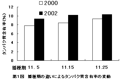タンパク質含有率は播種時期が早くなるほど低下する傾向にある(図1)。