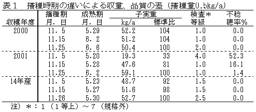 表1 播種時期の違いによる収量、品質の差(播種量0.5kg/a)