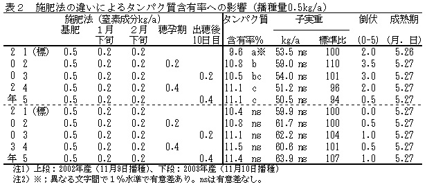 穂孕期に窒素成分でa当たり0.2kgの追肥を行うと10〜11%のタンパク質含有率が確保される(表2)。