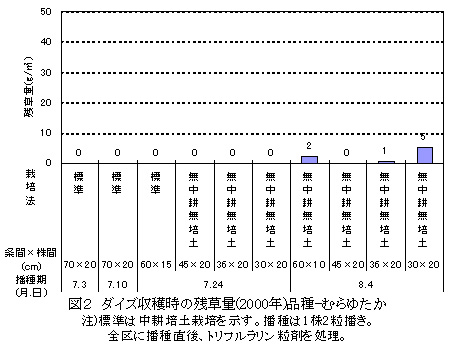 図2 ダイズ収穫時の残草量(2000年)品種-むらゆたか