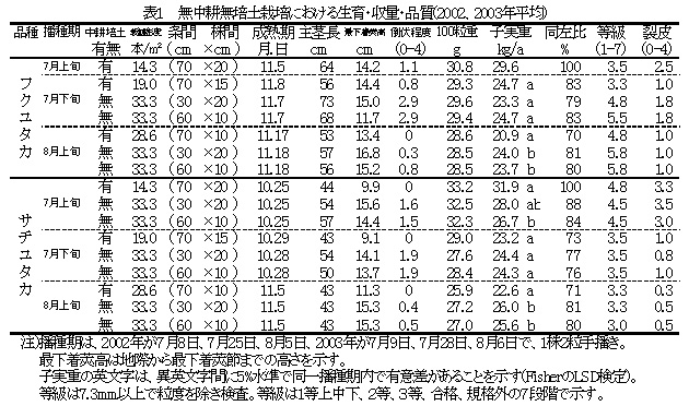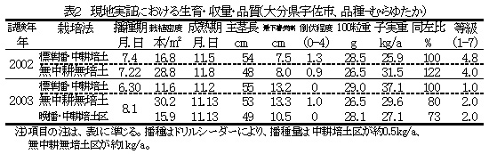 表1 無中耕無培土栽培における生育・収量・品質(2002、2003年平均)