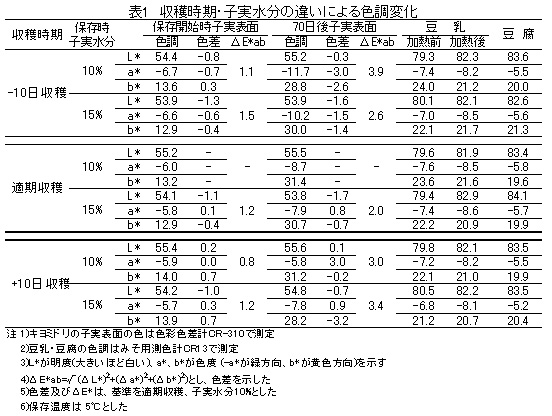 子実表面の色調は、成熟期より早く収穫すると濃く、収穫期が遅れるほど薄くなる(表1)。