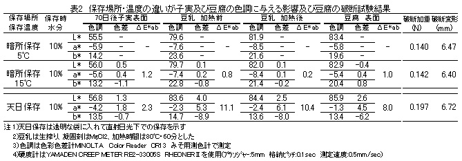 表2 保存場所・温度の違いが子実及び豆腐の色調に与える影響及び豆腐の破断試験結果