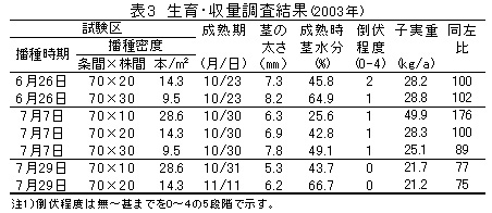 7月上旬播種で、栽植密度を条間70cm、株間10cmにすると、茎が細くなり、成熟期の茎水分が低くなるため莢先熟とならず、成熟期収穫が可能となる(表3)。
