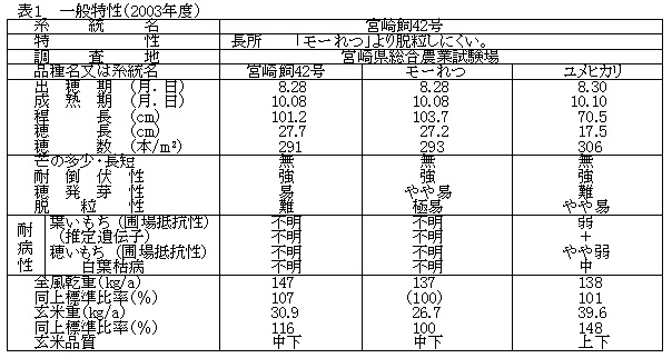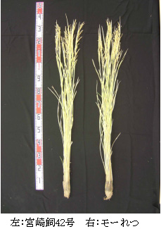 - 「宮崎飼42号」は飼料用水稲「モーれつ」にγ線を照射して難脱粒性とした突然変異系統である。脱粒性以外の特性は「モーれつ」と同等である。