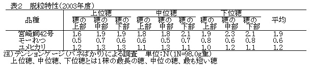 脱粒性は“極易”の「モーれつ」より3倍程度脱粒しにくく、「ユメヒカリ」より脱粒しにくい“難”である(表1、表2)。