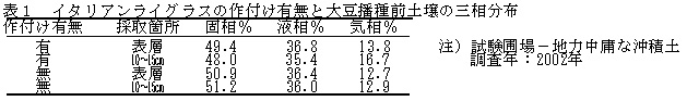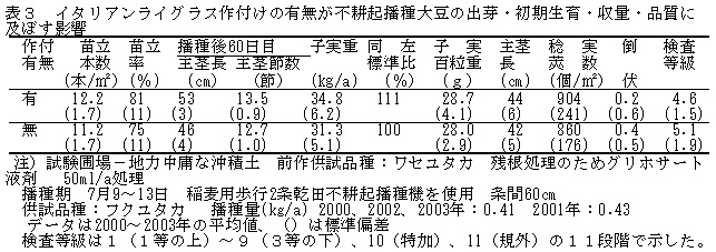 表3 イタリアンライグラス作付けの有無が不耕起播種大豆の出芽・初期生育・収量・品質に及ぼす影響