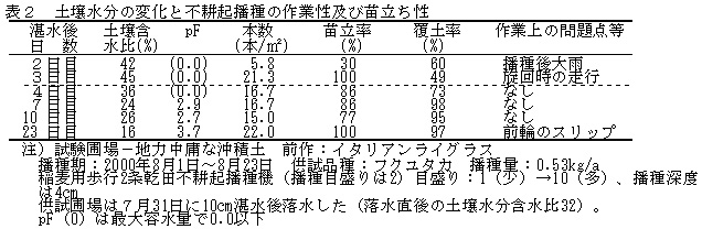 表2 土壌水分の変化と不耕起播種の作業性及び苗立ち性