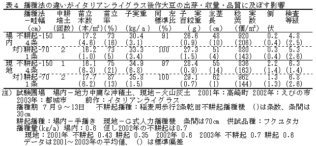 表4 播種法の違いがイタリアンライグラス後作大豆の出芽・収量・品質に及ぼす影響