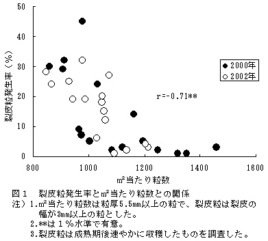 図1 裂皮粒発生率とm2当たり粒数との関係