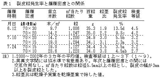 - 裂皮粒発生率とm2当たり粒数との間には高い負の相関関係が認められ、m2当たり粒数が減少すると裂皮粒発生率が高まる(図1)。株間を狭め苗立ち株数を増やすことで、m2当たり粒数が増加し、裂皮粒の発生率が低下する(表1)。