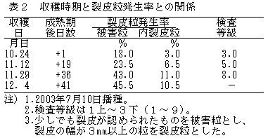 成熟期後日数が経過することでも裂皮粒発生率が高まり、検査等級の低下につながる(表2)ことから、成熟期後、速やかに収穫することが望ましい。