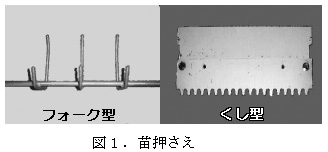 活着後の欠株率は、移植機の苗押さえをフォーク型からくし型にすることにより低下するが、慣行土付苗よりは10%程度多くなる(図1、表2)。