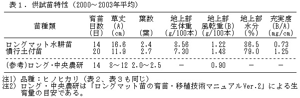 5月下旬播種、育苗日数14日で得られるロングマット水耕苗は、育苗日数20日の慣行土付苗に比較して草丈がかなり高くなる。地上部生体重は慣行土付苗より重いが、風乾重は軽く、地上部の水分が高い充実度の低い軟弱な苗となる(表1)。