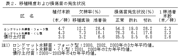 移植直後の欠株率は、移植機の苗押さえにフォーク型を用いた場合、慣行土付苗より10%程度多くなる。さらに、損傷苗の発生が多いため、活着後の欠株率は慣行土付苗より20%程度多くなる(図1、表2)。