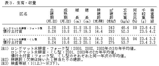 ロングマット水耕苗は、植え痛みにより活着が若干遅れるが、出穂期、成熟期は慣行土付苗とほぼ同じになる(表3)。