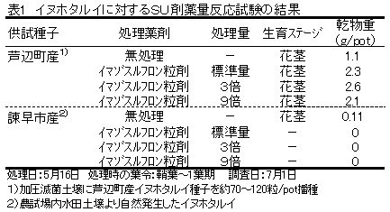 SU剤単剤による薬量反応試験(表1)、発根法(図1)の結果から、芦辺町で残草が認められたイヌホタルイはSU剤抵抗性バイオタイプである。