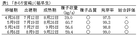 「きらり宮崎」は「コシヒカリ」より出穂が1〜4日早く、成熟期が同等ないし3〜4日早い。5月上旬〜6月上旬に移植すれば、収量が安定し、良質種子が生産できる(表1)。