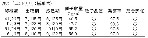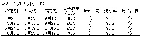 「コシヒカリ」と「ヒノヒカリ」は、いずれも4月下旬〜6月上旬に移植すれば、収量が安定し、良質種子が生産できる(表2、表3)。