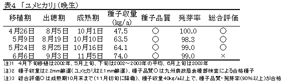 「ユメヒカリ」は「ヒノヒカリ」より出穂が8日程度遅く、成熟期は10〜19日遅い。4月下旬〜5月下旬に移植すれば、収量が安定し、良質種子が生産できる(表4)。