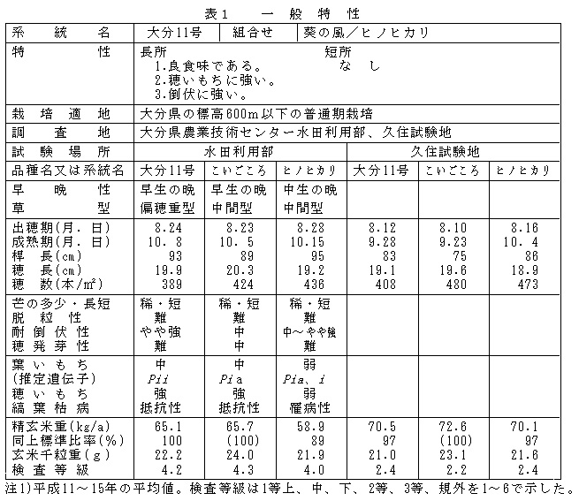 - 水稲新品種「大分11号」は出穂期が「こいごころ」より1〜2日遅い早生である。食味は「ヒノヒカリ」並の良食味である。葉いもち病圃場抵抗性は“中”程度であるが、穂いもち病抵抗性は“強”である。稈質が強く耐倒伏性は“やや強”である。