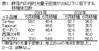 表1 群落内の相対光量子密度が20%以下に低下する移植後日数