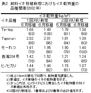 表2 飼料イネ移植栽培におけるイネ乾物重の品種間差(2002年)
