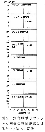 カンショ葉(アヤムラサキおよびシモン1号)、ヨモギ、ゴボウ葉のポリフェノール画分に麹菌抽出液を作用させることにより、カフェ酸誘導体がカフェ酸に変換される(図2)。よって、この手法はカフェ酸の製造法として利用できる。