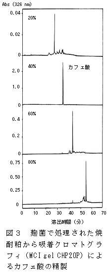 図3 麹菌で処理された焼酎粕から吸着クロマトグラフィ(MCI gel CHP20P)によるカフェ酸の精製