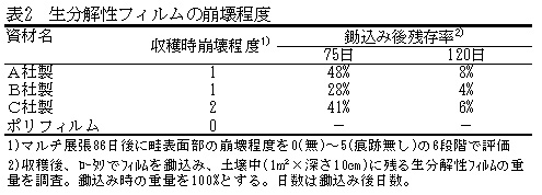 収穫時における生分解性フィルムの畦表面部の崩壊程度はいずれも小さい(表2)。