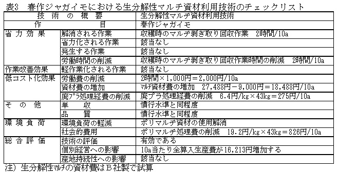 表3 春作ジャガイモにおける生分解性マルチ資材利用技術のチェックリスト