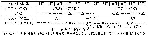 「シワスアオバ」と「アキアオバ」を9月中旬から10月上旬に混播した場合、収穫は出穂期刈りで12月中旬、4月上旬、5月中旬、6月下旬〜7月上旬の4回刈りとなり、イタリアンライグラス単一草種で約10ヶ月間作付可能となる(図1)。