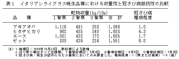 表1 イタリアンライグラス晩生品種における収量性と冠さび病抵抗性の比較