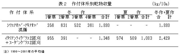 表2 作付体系別乾物収量(kg/10a)
