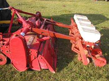 バヒアグラス草地を傷めないように1列おきにロータリの刃をはずして(畦幅36〜38cm)、刃を10〜15cmに切断し、ロータリと施肥播種機とを加工して連結することにより、追播が可能となる(図1、図2)。