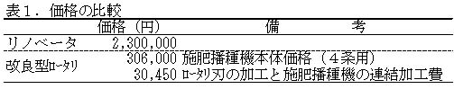 使い古しのロータリの刃や手持ちの施肥播種機を利用して加工することにより、安価で追播用機械が作製できる(表1)。