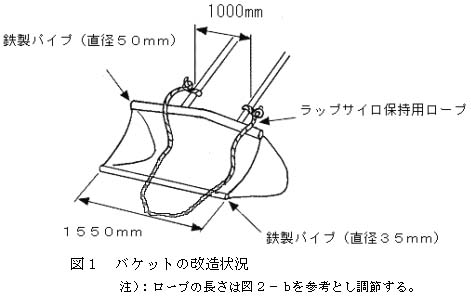 バケットの改造は、下部の縁に直径35mm程度、上部の縁に直径50mm程度の鉄製パイプを中央部が凹む様に仮溶接又はボルトとナットで固定し、直径10mm程度のビニル製ロープを、フロントローダの左右の支持部位からバケット上を通してバケットの下部約50cm程度まで垂らすように取り付ける(図1)。