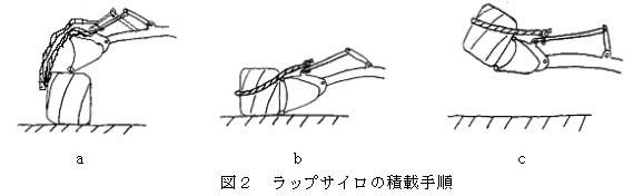 ロールベールラップサイロの積載は、(1)ロープをラップサイロ上部にかけ(図2-a)、(2)バケットの上下端をラップサイロに押し付け(図2-b)、(3)バケットをすくい上げて持ち上げる(図2-c)。バケットからの荷下ろしは、この逆の手順で行う。
